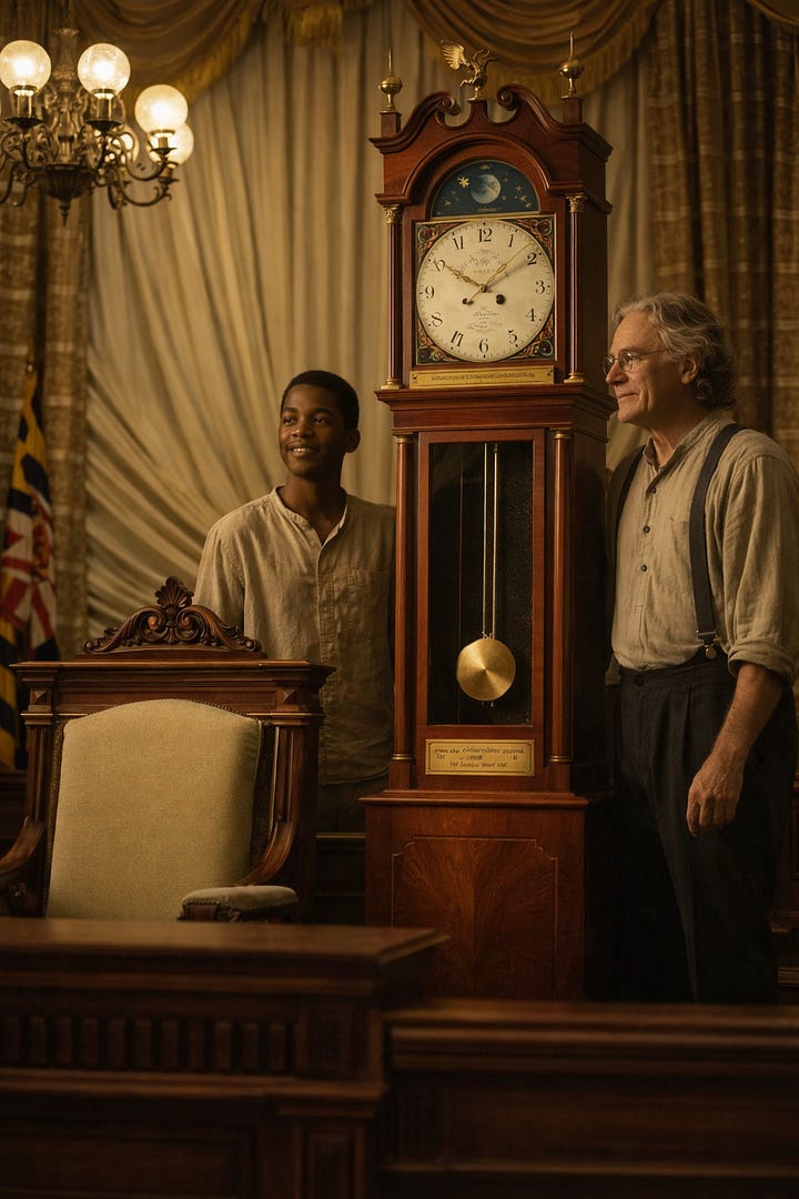 It is finished. This afternoon, young Ezra and I stood side by side in the chamber of the Maryland House of Delegates and watched the pendulum swing in measured grace. A tall case clock now marks the passage of hours above the Speaker’s chair. A stately guardian of deliberation, hewn from native cherry and fitted with brass and bone.